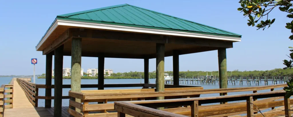 The park includes a small shellrock parking area with a designated bus space and a shaded bench near the entrance. An interpretive trail and boardwalk allow visitors to learn about the lagoon environment while traveling toward the water. Stairs from the boardwalk provide direct access for wading, and a canoe and kayak launch offers entry to the Indian River Lagoon. A fishing pier extends further into the estuary, and an open-air educational pavilion provides seating for group programs. A sidewalk also connects the site to nearby Santa Lucea Beach for additional shoreline access.