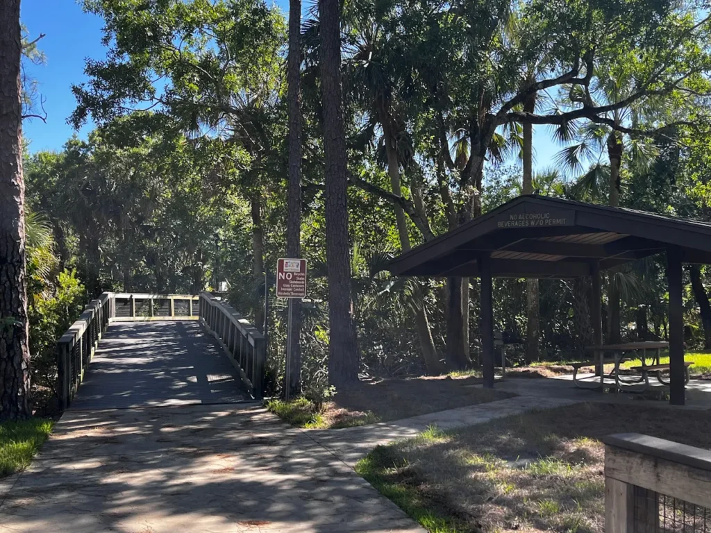 The structure is built from recycled materials and includes lighting and thermoplastic handrails for safety and durability. The elevated design allows visitors to observe river conditions, shoreline vegetation, and wetland habitats along the St. Lucie River. The boardwalk supports walking, wildlife viewing, and shoreline fishing.